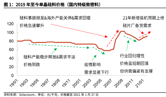 在硅料景氣度高漲的背景下,部分投資者擔心技術(shù)的更新迭代(顆粒硅技術(shù))將給硅料生產(chǎn)龍頭公司未來的發(fā)展前景帶來不確定性,但是我們認為,當前硅料環(huán)節(jié)的主要矛盾是2021年供需形式緊張(供不應(yīng)求)帶來的硅料供應(yīng)階段性緊缺,這也將推動硅料價格維持高位,甚至在特定時間或特殊因素催化下突破100元/千克的高位,從而保障硅料龍頭企業(yè)(通威股份、新特能源、東方希望、大全新能源等)2021年的業(yè)績增長和盈利能力維持;技術(shù)更新迭代則是當前時點的次要矛盾,F(xiàn)BR顆粒硅技術(shù)的確有望成為下一代光伏的硅料技術(shù),但是目前顆粒硅的產(chǎn)能、下游使用占比仍相對較低,需持續(xù)關(guān)注保利協(xié)鑫2021年6月底顆粒硅產(chǎn)能擴產(chǎn)至3萬噸后顆粒硅品質(zhì)的提升、下游硅片廠商應(yīng)用、以及成本的降低情況。(文章來源:光大證券)
