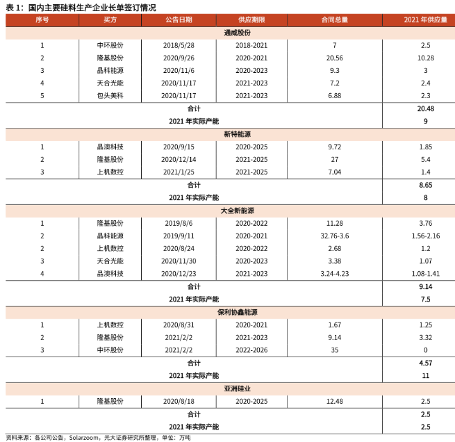 在經(jīng)歷了19年的硅料產(chǎn)能釋放周期后,2020年我國硅料產(chǎn)能增量有限,且海外OCI先后關(guān)停韓國兩家多晶硅工廠(總產(chǎn)能從7.9萬噸滑落至3.2萬噸),2020年國內(nèi)硅料在產(chǎn)產(chǎn)能從2019年的45.6萬噸小幅提升至48.4萬噸,全球硅料在產(chǎn)產(chǎn)能則從2019年底的62.2萬噸減少1.9萬噸至60.3萬噸。2021年,國內(nèi)的新產(chǎn)能投放大多集中在Q4,因此對全年的實際產(chǎn)能貢獻有限,預計2021年全球的硅料供應(yīng)量約為55萬噸,可滿足約170GW的硅片生產(chǎn)需求。與此同時,下游的硅片廠商則在高利潤留存的背景下在2019年開啟了大規(guī)模擴產(chǎn)浪潮。2019年在上游環(huán)節(jié)價格下跌的情況下硅片價格依然堅挺,單晶硅片環(huán)節(jié)相較其他供應(yīng)鏈環(huán)節(jié)仍存在較高的利潤空間,因此各硅片企業(yè)均開啟了較為激進的擴張計劃,全國單晶硅片總名義產(chǎn)能從2019年的120GW擴張至2020年的217GW。展望2021年,各大硅片龍頭及二、三線硅片企業(yè)仍維持了較大規(guī)模的產(chǎn)能擴張節(jié)奏,2021年底的單晶硅片名義產(chǎn)能有望再創(chuàng)新高突破300GW。在2021年硅料實際貢獻有限、而硅片產(chǎn)能大幅擴張的背景下,硅片廠商于2020Q3開始密集通過和上游硅料企業(yè)簽訂鎖量不鎖價的硅料供貨長協(xié)鎖定硅料供應(yīng),從而滿足自身的生產(chǎn)需求。根據(jù)我們的統(tǒng)計,2021年已有超過80%的硅料產(chǎn)能被長協(xié)合同鎖定,主流硅料生產(chǎn)廠商中僅有保利協(xié)鑫的部分硅料產(chǎn)能尚未簽訂長協(xié)合同。