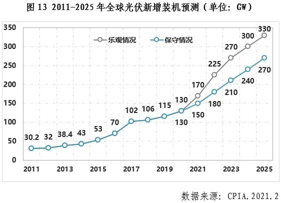 (二)我國光伏市場將進(jìn)入快速發(fā)展新階段2021年是“十四五”規(guī)劃的開局之年,也是我國光伏發(fā)電進(jìn)入平價上網(wǎng)的關(guān)鍵之年。2021年我國光伏應(yīng)用市場將繼續(xù)保持快速增長勢頭,預(yù)計新增裝機規(guī)??蛇_(dá)55-65GW,其中競價結(jié)轉(zhuǎn)項目10GW左右,戶用市場有望達(dá)到15GW,工商業(yè)分布式預(yù)計在10GW左右,外送及平價地面電站在20-30GW左右。在“碳達(dá)峰、碳中和”目標(biāo)下, “十四五”期間我國光伏市場將迎來市場化建設(shè)高峰,預(yù)計國內(nèi)年均光伏裝機新增規(guī)模在70-90GW,有望進(jìn)一步加速我國能源轉(zhuǎn)型。