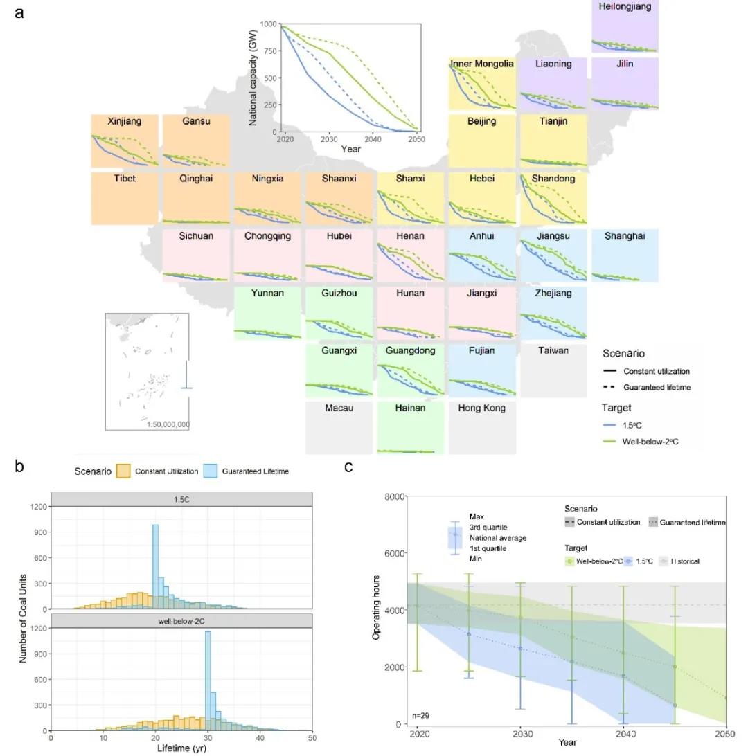為實(shí)現(xiàn)《巴黎協(xié)定》氣候目標(biāo),未來(lái)30年中國(guó)需要在燃煤發(fā)電行業(yè)實(shí)現(xiàn)深度減排,并達(dá)到凈零排放。近期發(fā)表于《自然-通訊》上的研究對(duì)中國(guó)實(shí)現(xiàn)氣候目標(biāo)和減排途徑的可行性展開了分析,研究者們首先依據(jù)技術(shù)屬性、盈利能力、環(huán)境影響對(duì)中國(guó)1037個(gè)現(xiàn)役燃煤電廠的退役優(yōu)先級(jí)進(jìn)行逐一評(píng)估,并結(jié)合全球升溫1.5°C和2°C目標(biāo)情景,提出了可持續(xù)的中國(guó)燃煤電廠退出路徑選擇。研究發(fā)現(xiàn),為實(shí)現(xiàn)氣候目標(biāo),中國(guó)需要在短期內(nèi)停止新建燃煤電廠,優(yōu)先退役落后產(chǎn)能,可以通過降低利用小時(shí),保障大部分機(jī)組20年(1.5°C目標(biāo))或30年(2°C目標(biāo))的運(yùn)行年限,并在2045年(1.5°C目標(biāo))或2055年(2°C目標(biāo))前實(shí)現(xiàn)全面的煤電退出。