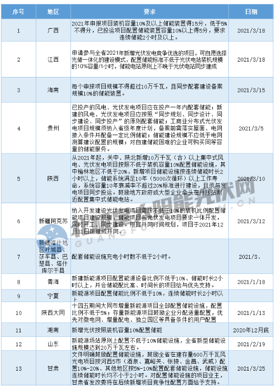 就消納掣肘,光伏電站配置儲能成為政策導向。據(jù)北極星太陽能光伏網(wǎng)統(tǒng)計,2021開年以來,廣西、江西、貴州、山東、海南等13個地區(qū)要求風、光項目強配儲能,比例在5%~10%之間,連續(xù)儲能在2小時及以上。然而在儲能經(jīng)濟性仍未達到預期且獲利商業(yè)模式仍未明朗下,強配儲能對于光伏電站投資業(yè)主來說無疑是雪上加霜。
