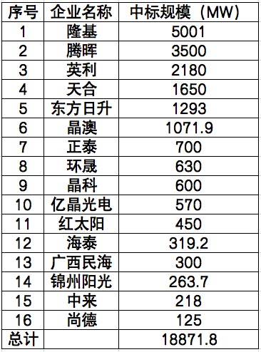 從定標(biāo)情況來(lái)看,由于部分央企采取的是框架招標(biāo),實(shí)際中標(biāo)人并未明確,在剔除此類招標(biāo)逾10GW后,明確中標(biāo)人的定標(biāo)規(guī)模約為19GW。其中,中標(biāo)規(guī)模TOP5依次為隆基、騰暉、英利、天合、東方日升;在一二線組件企業(yè)占比中,TOP6組件企業(yè)中標(biāo)規(guī)模總計(jì)為9.616GW,占明確中標(biāo)人總規(guī)模比重為51%。