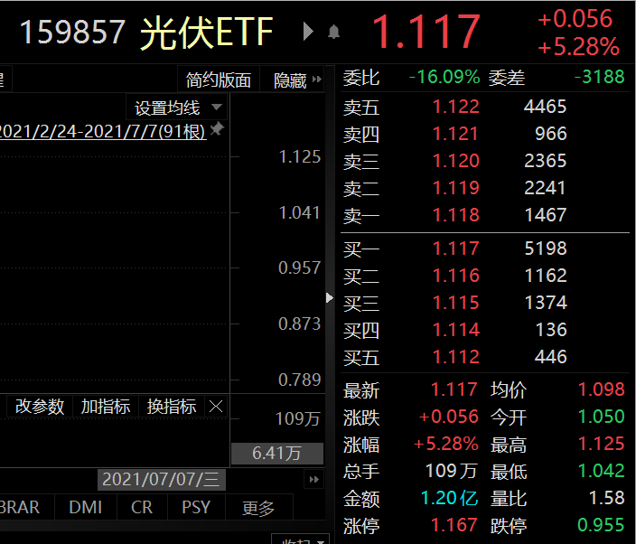 據(jù)悉,截止今日收盤,光伏ETF(159857)今日上漲5.28%,成交額為1.20億元。