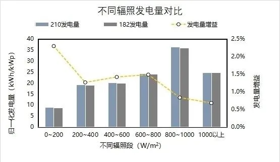 2. 210組件的低輻照性能優(yōu)勢顯著,對發(fā)電量有明顯提升。