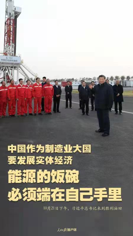 10月21日下午,習(xí)近平總書記來到勝利油田,登上鉆井平臺(tái),察看作業(yè)情況,看望慰問石油工人。今年是勝利油田發(fā)現(xiàn)60周年。習(xí)近平代表黨中央向廣大石油職工致以誠(chéng)摯問候。習(xí)近平指出,石油能源建設(shè)對(duì)我們國(guó)家意義重大,中國(guó)作為制造業(yè)大國(guó),要發(fā)展實(shí)體經(jīng)濟(jì),能源的飯碗必須端在自己手里。希望你們?cè)賱?chuàng)佳績(jī)、再立新功。