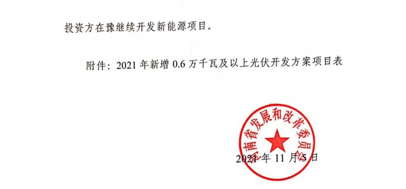 11月5日,河南省發(fā)改委下發(fā)《關(guān)于下達(dá) 2021年新增0.6萬(wàn)千瓦及以上光伏項(xiàng)目開(kāi)發(fā)方案的通知》。文件指出,對(duì)于不新增用地、利用固定建筑物及其附屬場(chǎng)所建設(shè)的光伏項(xiàng)目,不限申報(bào)規(guī)模!