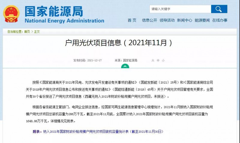 根據(jù)各省級(jí)能源主管部門(mén)、電網(wǎng)企業(yè)報(bào)送信息,經(jīng)國(guó)家可再生能源信息管理中心梳理統(tǒng)計(jì),2021年11月新納入國(guó)家財(cái)政補(bǔ)貼規(guī)模戶用光伏項(xiàng)目總裝機(jī)容量為286萬(wàn)千瓦。截至2021年11月底,全國(guó)累計(jì)納入2021年國(guó)家財(cái)政補(bǔ)貼規(guī)模戶用光伏項(xiàng)目裝機(jī)容量為1648.86萬(wàn)千瓦。詳細(xì)情況見(jiàn)附表。
