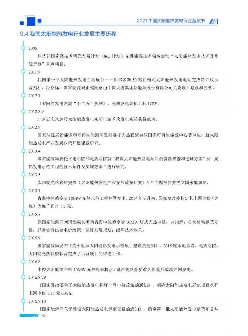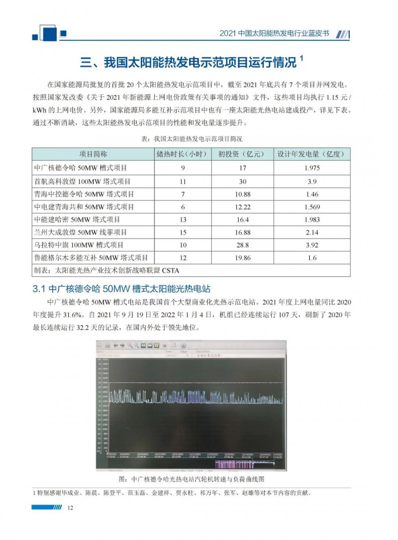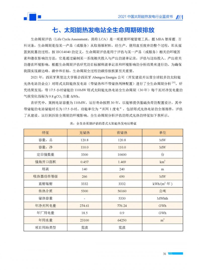 2021中國太陽能熱發(fā)電行業(yè)藍(lán)皮書(以下簡稱“藍(lán)皮書”)共分為9個章節(jié),分別為:太陽能熱發(fā)電的發(fā)展機遇和定位、太陽能熱發(fā)電市場發(fā)展、我國太陽能熱發(fā)電示范項目運行情況、我國太陽能熱發(fā)電產(chǎn)業(yè)鏈情況、我國太陽能熱發(fā)電研發(fā)項目情況、太陽能熱發(fā)電投資成本、太陽能熱發(fā)電站全生命周期碳排放、太陽能熱發(fā)電發(fā)展面臨的挑戰(zhàn)及對策,以及附錄。附錄主要包括:我國2021年發(fā)布的太陽能熱發(fā)電項目政策、美國能源部2021年度支持的太陽能熱發(fā)電項目清單、2021年發(fā)布的太陽能熱發(fā)電相關(guān)國家標(biāo)準(zhǔn)、我國太陽能熱發(fā)電行業(yè)發(fā)展主要歷程、太陽能光熱聯(lián)盟理事成員單位及業(yè)務(wù)范圍名錄。全文4.5萬+字,共55張圖表。