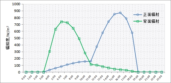 圖3為典型日的正面背面輻照度比較,輻照度大小與太陽(yáng)的方位有關(guān)。上午時(shí)刻,太陽(yáng)的方位位于東面,組件背面主要接收直接輻射、地面的反射和大氣中的散射輻射,組件正面主要接收大氣中的散射輻射和地面的一部分反射輻射,而到了下午正好相反。
