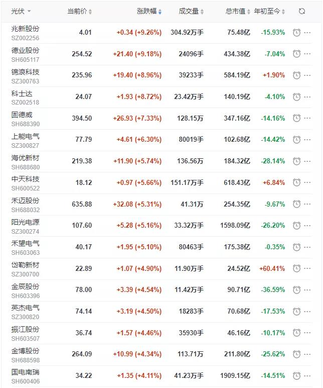 個(gè)股方面,兆新股份、德業(yè)股份漲超9%,錦浪科技漲幅達(dá)到8.96%,固德威漲超7%,上能電氣漲超6%,禾邁股份、陽(yáng)光電源等漲超5%,天合光能、賽伍技術(shù)、中來(lái)股份、通威股份、晶澳科技等漲超3%,正泰電器、中信博、特變電工、高測(cè)股份、隆基股份等漲超2%,邁為股份、愛(ài)旭股份、通靈股份、東方日升等漲超1%。