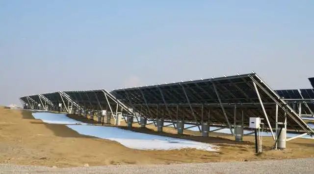 一望無際的光伏發(fā)電板在陽光照射下,像向日葵一樣隨著太陽的位置自動轉(zhuǎn)動。“這是采取跟蹤光伏技術(shù),能最大化利用太陽光能。”隆基清潔能源西北區(qū)域總經(jīng)理劉興兵告訴記者,該電站采用隆基最新單晶雙面半片組件等設(shè)備及智能運維技術(shù),可實現(xiàn)每年發(fā)電36789.85萬千瓦時,相比傳統(tǒng)的固定式支架單面組件發(fā)電模式,能增加近11%的發(fā)電量。