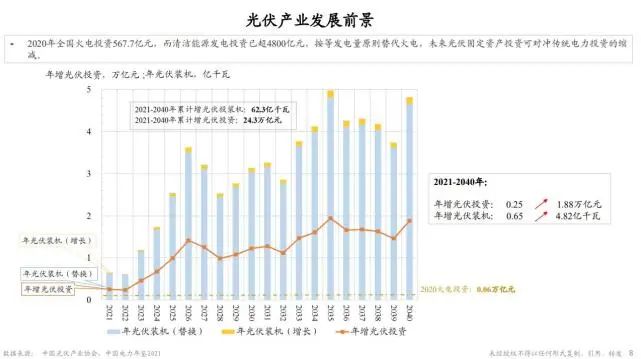 按照剛才的演進(jìn)路徑,光伏產(chǎn)業(yè)投資假如從2021年開始,新增的電源都是由光伏裝機(jī)來實現(xiàn),那么下面這張圖就展示了未來的20年的一個投資逐漸增加的過程,從開始大概0.25萬億,到后來大概2萬億的年投資,整個全過程完成約20年,總共的投資規(guī)模大概是20多萬億元。