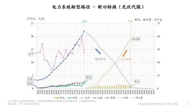 下面我們談一下,如果經(jīng)過進(jìn)一步論證,證明光伏能源作為一個可再生能源,有足夠大的規(guī)模可以替代煤炭做能源的基礎(chǔ),我們應(yīng)該怎么轉(zhuǎn)型?下面這張圖上左邊這一半實際上是2000年到2020年整個電力企業(yè)的裝機(jī)總量在不斷累積增加,今天大約有70%的發(fā)電還是用火電的技術(shù)設(shè)備。