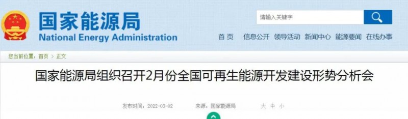 會議圍繞研究促進2022年風電光伏開發(fā)建設,聽取了上次月度形勢分析會意見建議落實情況及全國可再生能源電力發(fā)展情況匯報,與會單位反映了大型風電光伏基地項目并網和送出工程、林草地使用、項目核準、選址調整、項目整合等問題,并提出了相關建議。2022年風電光伏發(fā)展開局良好,1月份全國風電光伏新增裝機超過1200萬千瓦,風光電消納利用率保持在較高水平。