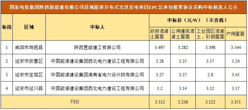 3月2日,國家電投集團陜西新能源有限公司縣域屋頂分布式光伏發(fā)電項目EPC總承包框架協(xié)議采購中標候選人公示。項目合計規(guī)模為213MW,陜西置能建工有限公司中標咸陽市旬邑縣12MW屋頂分布式項目,中能建三個子公司中標剩余201MW項目。所有項目均價為3.26元/W。
