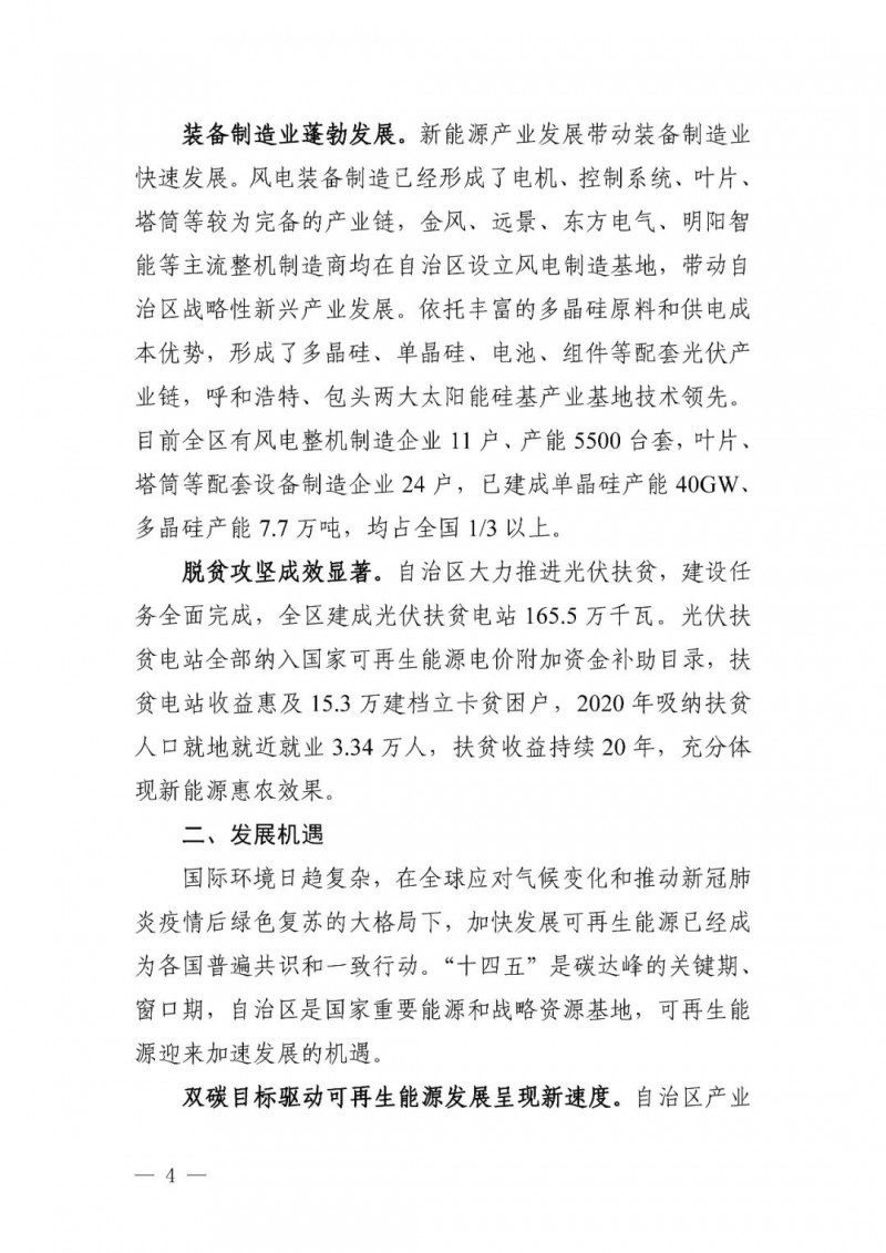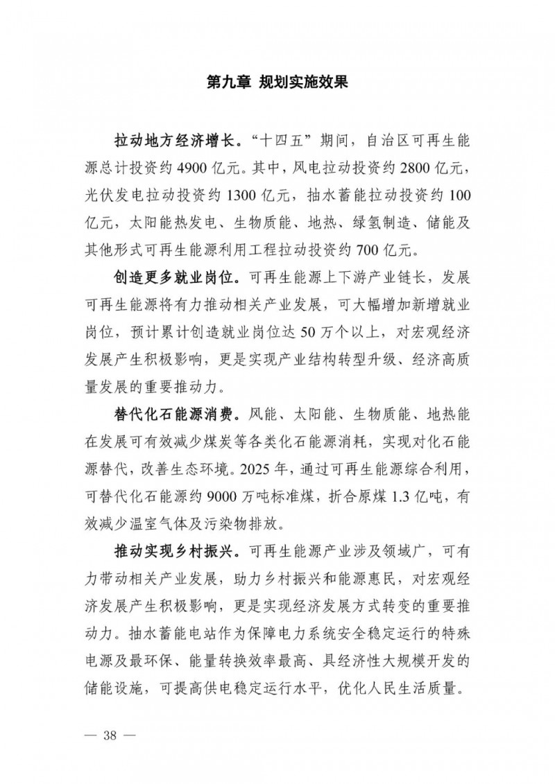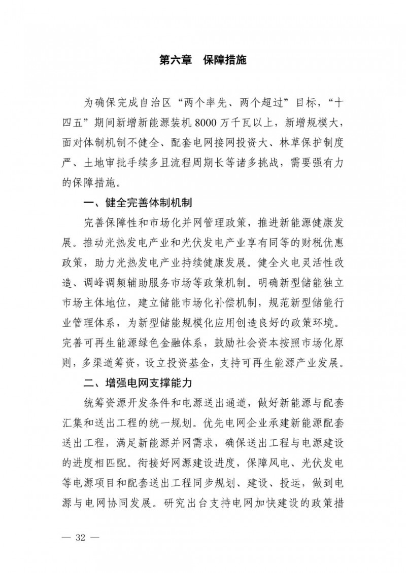 可再生能源發(fā)電目標(biāo)。自治區(qū)可再生能源發(fā)電裝機(jī)達(dá)到 1.35 億千瓦以上,其中風(fēng)電 8900 萬(wàn)千瓦、光伏發(fā)電 4500 萬(wàn)千瓦,新能源裝機(jī)規(guī)模超過(guò)燃煤火電裝機(jī)規(guī)模,新能源發(fā)電量占自治區(qū)總發(fā)電量比重超過(guò)35%。“十四五”期間可再生能源新增裝機(jī) 8000 萬(wàn)千瓦以上,占全部新增裝機(jī)的比重超過(guò) 60%,成為新增裝機(jī)的主力。