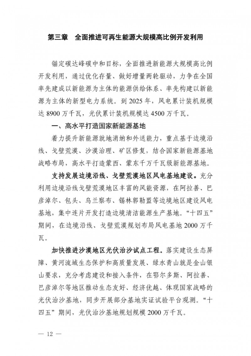 3月3日,內(nèi)蒙古自治區(qū)能源局網(wǎng)站公開(kāi)發(fā)布了“內(nèi)蒙古自治區(qū)能源局關(guān)于印發(fā)《內(nèi)蒙古自治區(qū)“十四五”可再生能源發(fā)展規(guī)劃》的通知(內(nèi)能新能字〔2022〕103號(hào))”,根據(jù)規(guī)劃,“十四五”時(shí)期,我區(qū)可再生能源主要發(fā)展目標(biāo)如下: