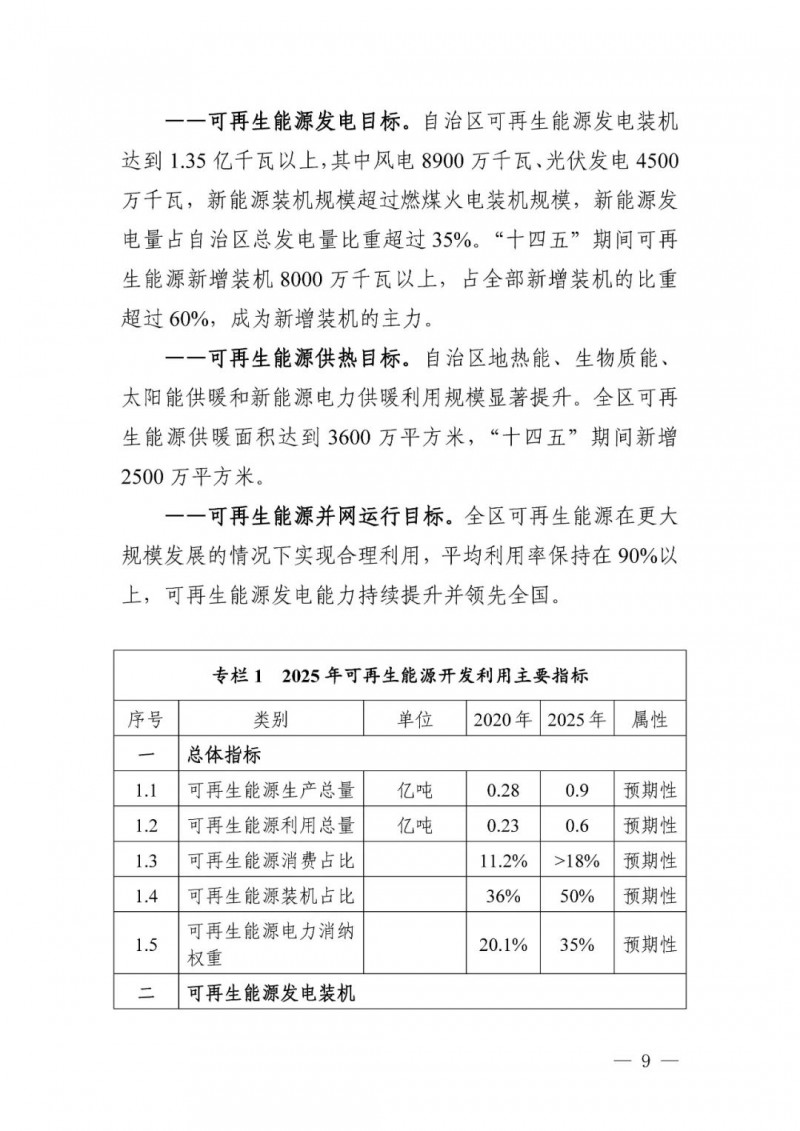 可再生能源總量目標(biāo)。至2025 年,自治區(qū)可再生能源生產(chǎn)總量超過(guò) 9000萬(wàn)噸標(biāo)準(zhǔn)煤,可再生能源區(qū)內(nèi)利用量超過(guò)6000萬(wàn)噸標(biāo)準(zhǔn)煤,占當(dāng)年一次能源消費(fèi)總量的18%以上,超過(guò)全國(guó)平均水平。