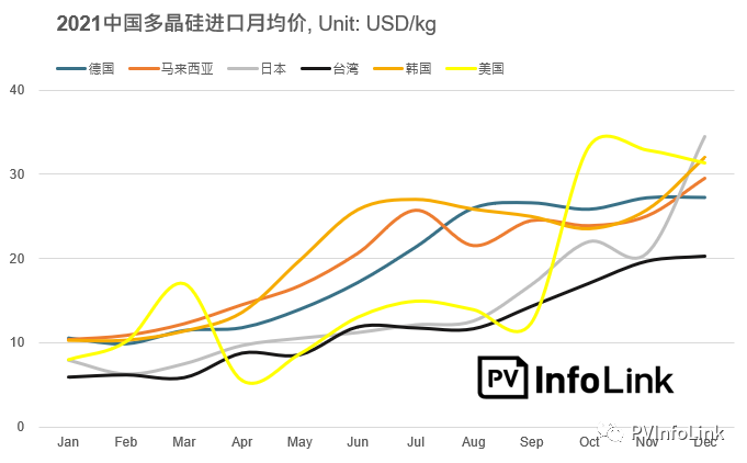 價(jià)格方面,各地區(qū)進(jìn)口的硅料價(jià)格在2021年隨市場(chǎng)均價(jià)普遍呈現(xiàn)逐月上漲的趨勢(shì),與整年多晶硅市場(chǎng)的價(jià)格變化趨勢(shì)相符。個(gè)別國家的價(jià)格表現(xiàn)上,具有較穩(wěn)定產(chǎn)能與產(chǎn)品品質(zhì)的德國和馬來西亞的價(jià)格表現(xiàn)較佳,而其他進(jìn)口量較小或是透過轉(zhuǎn)口貿(mào)易方式的進(jìn)口市場(chǎng)則在價(jià)格穩(wěn)定性的表現(xiàn)上不如德國和馬來西亞。