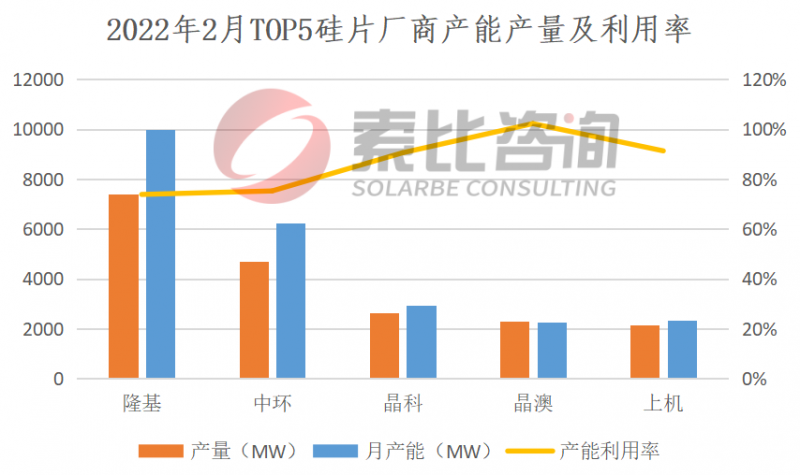 2022年2月,盡管一線企業(yè)開工率提升超過70%,但硅片仍供不應(yīng)求。2022年2月國內(nèi)硅片產(chǎn)量24.9GW,環(huán)比增長20.9%。按照產(chǎn)量排名,隆基、中環(huán)、晶科、晶澳、上機位列前五,企業(yè)總產(chǎn)量19.15GW,占比76.91%,綜合利用率86.6%。預(yù)計3月份硅片繼續(xù)維持供不應(yīng)求態(tài)勢。從供應(yīng)端來看,3月份基礎(chǔ)產(chǎn)量已達(dá)上限。從需求端來看,海外需求刺激預(yù)期將延續(xù)至3月底。