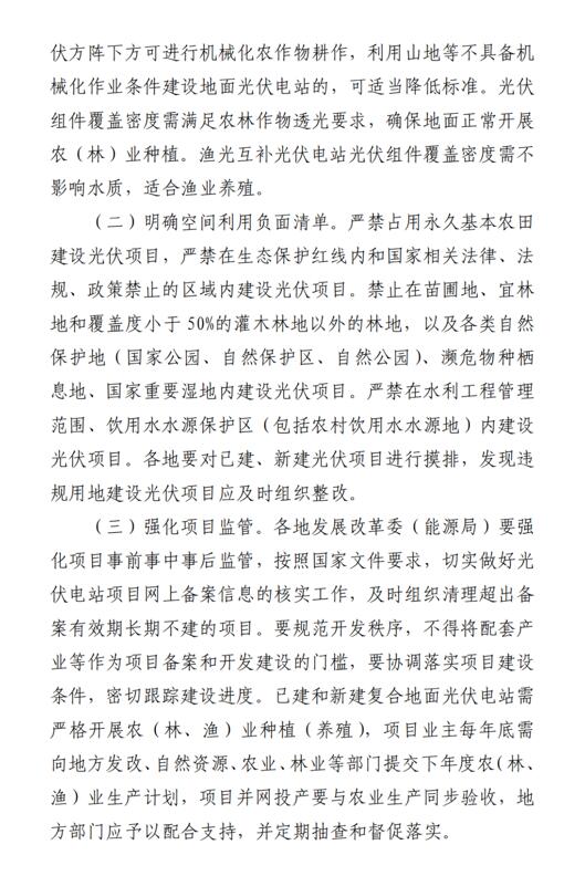 用地方面,允許在設(shè)施農(nóng)業(yè)上建設(shè)農(nóng)光互補(bǔ)、菌光互補(bǔ)項(xiàng)目,利用農(nóng)用地布設(shè)的光伏方陣可不改變?cè)玫匦再|(zhì)。光伏復(fù)合項(xiàng)目應(yīng)堅(jiān)持“以農(nóng)為先”,新建復(fù)合地面光伏電站光伏組件安裝高度最低處不低于2米,方陣前后陣列中心間距原則上不少于7米。嚴(yán)禁占用永久基本農(nóng)田、在生態(tài)保護(hù)紅線內(nèi)以及各類自然保護(hù)地建設(shè)光伏項(xiàng)目。此外,已建和新建復(fù)合地面光伏電站需嚴(yán)格開(kāi)展農(nóng)(林、漁)業(yè)種植(養(yǎng)殖),項(xiàng)目業(yè)主每年底需向地方發(fā)改委、自然資源、農(nóng)業(yè)、林業(yè)等部門(mén)提交下年度農(nóng)(林、漁)業(yè)生產(chǎn)計(jì)劃,項(xiàng)目并網(wǎng)投產(chǎn)要與農(nóng)業(yè)生產(chǎn)同步驗(yàn)收。