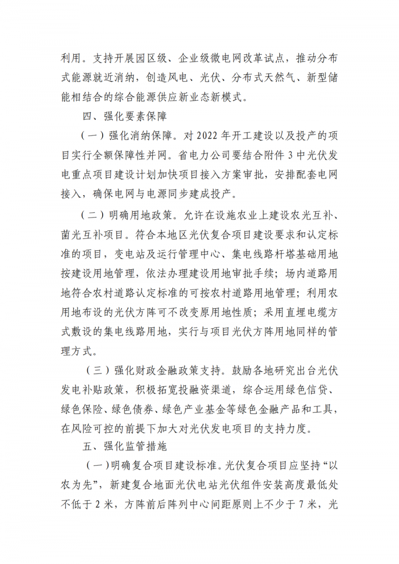 在具體保障措施方面,要求對(duì)2022年開(kāi)工建設(shè)以及投產(chǎn)的項(xiàng)目實(shí)行全額保障性并網(wǎng),安排配套電網(wǎng)接入,確保電網(wǎng)與電源同步建成投產(chǎn)。規(guī)范開(kāi)發(fā)秩序,不得將配套產(chǎn)業(yè)等作為項(xiàng)目備案和開(kāi)發(fā)建設(shè)的門(mén)檻。