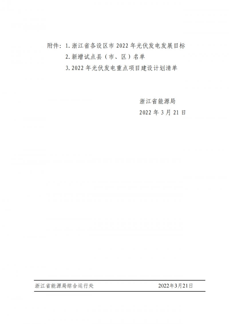 除此外,浙江省能源局要求持續(xù)加快分布式光伏建設(shè),并擴(kuò)大整縣(市、區(qū))屋頂分布式光伏開(kāi)發(fā)試點(diǎn)建設(shè)范圍,新增36個(gè)整縣試點(diǎn)名單,列入試點(diǎn)名單縣(市、區(qū))2022年光伏新增不得少于50MW,總規(guī)模為1.8GW。