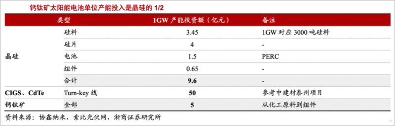 光伏企業(yè)投資1GW晶硅電池,需要從硅料、硅片、電池、組件合計超過9億元;而協(xié)鑫納米披露的數(shù)據(jù)顯示,其建造的鈣鈦礦百兆瓦產(chǎn)線投資為1億元,1GW的投資僅為5億元。也就是說,1GW鈣鈦礦電池的投資強度僅為晶硅的一半。