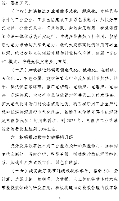 加快推進(jìn)終端用能電氣化、低碳化。在鋼鐵、石化化工、有色金屬、建材等重點(diǎn)行業(yè)及其他行業(yè)加熱、烘干、蒸汽供應(yīng)等環(huán)節(jié),推廣電爐鋼、電鍋爐、電窯爐、電加熱、高溫?zé)岜?、大功率電熱?chǔ)能鍋爐等替代工藝技術(shù)裝備,擴(kuò)大電氣化終端用能設(shè)備使用比例。穩(wěn)妥有序?qū)I(yè)生產(chǎn)過(guò)程中低溫?zé)嵩催M(jìn)行電氣化改造。鼓勵(lì)優(yōu)先使用可再生能源滿足電能替代項(xiàng)目的用電需求。到2025年,電能占工業(yè)終端能源消費(fèi)比重達(dá)到30%左右。