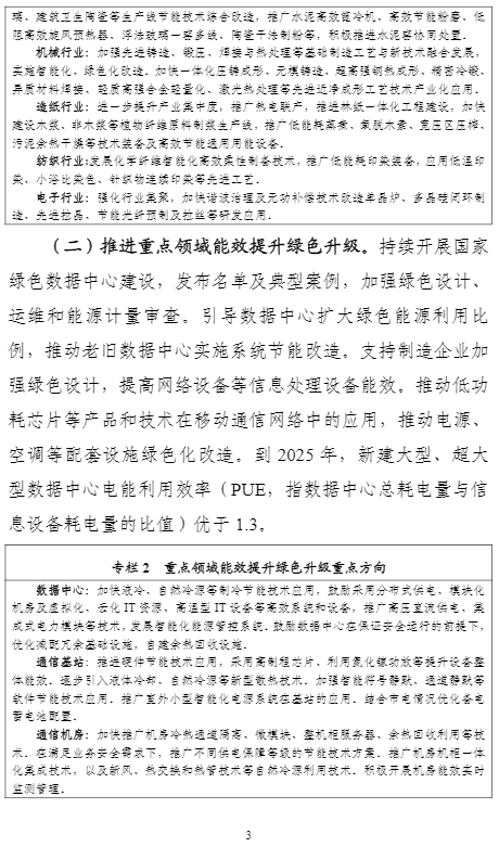計(jì)劃提出,到2025年,重點(diǎn)工業(yè)行業(yè)能效全面提升,數(shù)據(jù)中心等重點(diǎn)領(lǐng)域能效明顯提升,綠色低碳能源利用比例顯著提高,節(jié)能提效工藝技術(shù)裝備廣泛應(yīng)用,標(biāo)準(zhǔn)、服務(wù)和監(jiān)管體系逐步完善,鋼鐵、石化化工、有色金屬、建材等行業(yè)重點(diǎn)產(chǎn)品能效達(dá)到國(guó)際先進(jìn)水平,規(guī)模以上工業(yè)單位增加值能耗比2020年下降13.5%。能盡其用、效率至上成為市場(chǎng)主體和公眾的共同理念和普遍要求,節(jié)能提效進(jìn)一步成為綠色低碳的“第一能源”和降耗減碳的首要舉措。
