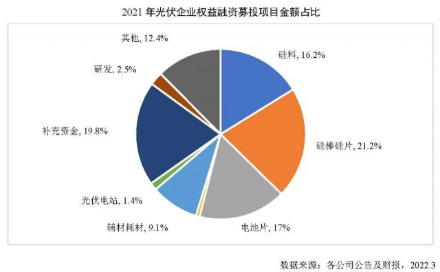 2021年我國光伏行業(yè)融資環(huán)境持續(xù)改善,共27家光伏企業(yè)在A股及港股資本市場使用權(quán)益融資方式募資,涉及權(quán)益融資項(xiàng)目28個(gè),募資總額1058.33億元,同比增長48.2%。其中,再融資項(xiàng)目21個(gè),募集資金758億元,同比增長30%;IPO上市融資項(xiàng)目7個(gè),募集資金301億元,同比增長129.2%。截至2022年3月,2021年權(quán)益融資項(xiàng)目中,已完成融資合計(jì)700.77億元,同比增長16.3%。