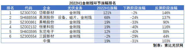 結(jié)合產(chǎn)業(yè)鏈環(huán)節(jié)來看,議價能力、盈利能力更強的硅片、硅料兩大環(huán)節(jié)以37%和33%的平均漲幅(指個股漲幅中位數(shù),下同)位居前兩位;受益于歐洲戶儲市場全面爆發(fā)的逆變器環(huán)節(jié)位居第三,平均漲幅達(dá)到20%;硅片薄片化趨勢下消耗量顯著提升且競爭格局穩(wěn)定、盈利能力較強的金剛線環(huán)節(jié)平均漲幅達(dá)到19%;盈利能力不佳但正處于N型電池技術(shù)窗口期的電池片環(huán)節(jié)平均漲幅達(dá)到12%。