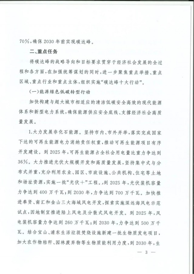能源綠色低碳轉(zhuǎn)型行動(dòng)提出,到2025年,可再生能源占全社會(huì)用電量比重力爭(zhēng)達(dá)到36%。堅(jiān)持集中式與分布式并重,實(shí)施一批“光伏+“工程。到2025年,光伏裝機(jī)容量力爭(zhēng)達(dá)到400萬千瓦;到2030年,力爭(zhēng)達(dá)到700萬千瓦。加快推進(jìn)奉賢、南匯和金山三大海域風(fēng)電開發(fā),探索實(shí)施深遠(yuǎn)海風(fēng)電示范試點(diǎn),因地制宜推進(jìn)陸上風(fēng)電及分散式風(fēng)電開發(fā)。到2025年,風(fēng)電裝機(jī)容量力爭(zhēng)達(dá)到260萬千瓦;到2030年,力爭(zhēng)達(dá)到500萬千瓦。結(jié)合寶山、浦東生活垃圾焚燒設(shè)施新建一批生物質(zhì)發(fā)電項(xiàng)目,到2030年,生物質(zhì)發(fā)電裝機(jī)容量達(dá)到84萬千瓦。