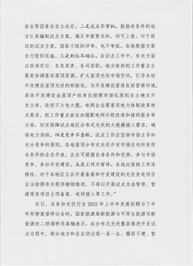 啟動整縣(市、區(qū))推進屋頂分布式光伏開發(fā)試點工作,主要目的就是充分調(diào)動和發(fā)揮地方積極性,引導地方政府協(xié)調(diào)更多屋頂資源,進一步開拓市場,擴大屋頂分布式光伏的建設規(guī)模。去年,國家能源局提出“在開展整縣(市、區(qū))推進屋頂分布式光伏開發(fā)試點工作中需要著重把握以下五個方面:一是自愿不強制。各地是否開展試點以及開展多少個試點由各地根據(jù)自身實際情況自己決定,不搞行政命令。建筑屋頂是否開展建設,由屋頂產(chǎn)權單位綜合考慮屋頂承重、安全等因素后自主決定。二是試點不審批。鼓勵有條件的地方認真編制試點方案,滿足申報要求的,均可上報。對于報送的試點方案,國家不組織評審,也不審批。各地根據(jù)方案自行組織實施。三是到位不越位。在試點工作中,有關方面應找準定位、各負其責、各司其職。地方政府的工作重點主要是協(xié)調(diào)落實屋頂資源,擴大屋頂光伏市場空間,引導本地開發(fā)建設屋頂光伏的積極性,為開發(fā)建設營造良好營商環(huán)境,具體開發(fā)建設由屋頂產(chǎn)權單位按照市場化原則自主確定開發(fā)主體,政府不大包大攬。電網(wǎng)企業(yè)要落實電力體制改革相關要求,把工作重點放在加強配電網(wǎng)升級改造和接網(wǎng)服務等方面,切實保障試點地區(qū)分布式光伏的大規(guī)模接入需求,確保電力消納。四是競爭不壟斷。試點工作應堅持市場主導和充分競爭的原則。各地屋頂分布式光伏開發(fā)市場應向所有符合條件的企業(yè)開放,企業(yè)可根據(jù)自身條件和優(yōu)勢,參與市場競爭,參加開發(fā)建設。五是工作不暫停。各地應保持工作連續(xù)性,對于本地區(qū)正在開展備案和開發(fā)建設的光伏發(fā)電項目應當按照有關程序繼續(xù)推進,不得以開展試點為由暫停、暫緩現(xiàn)有項目立項備案、電網(wǎng)接入等工作。”