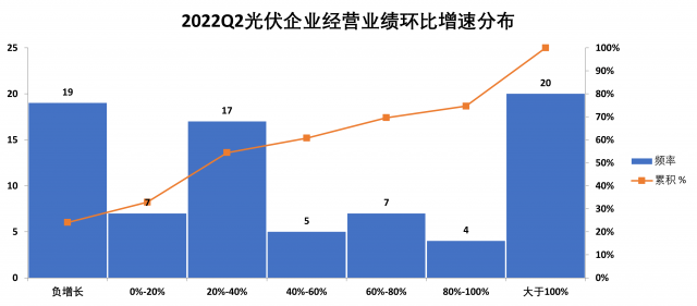 相比于營(yíng)收的普漲態(tài)勢(shì),光伏企業(yè)的經(jīng)營(yíng)業(yè)績(jī)卻出現(xiàn)顯著分化。2022年上半年,79家光伏企業(yè)的歸母凈利潤(rùn)總額達(dá)到650億元,平均增速為32%。其中,利潤(rùn)負(fù)增長(zhǎng)的企業(yè)占比高達(dá)32%,而業(yè)績(jī)翻倍增長(zhǎng)的企業(yè)占比亦達(dá)到28%,呈現(xiàn)顯著的“兩極分化”態(tài)勢(shì)。不過(guò),與2021年不同的是,產(chǎn)業(yè)鏈中游的諸多專業(yè)化廠商紛紛迎來(lái)“困境反轉(zhuǎn)”,而業(yè)績(jī)出現(xiàn)下滑的企業(yè)多為競(jìng)爭(zhēng)力一般的中小市值企業(yè)。