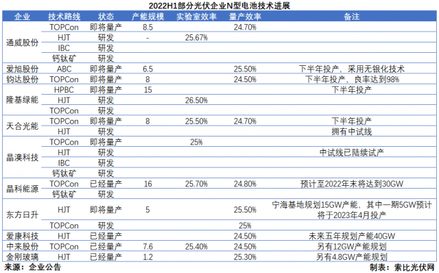 除了盈利能力以及經(jīng)營(yíng)業(yè)績(jī)顯著改善以外,電池片環(huán)節(jié)的N型電池技術(shù)變革也成為了時(shí)下業(yè)界以及資本市場(chǎng)關(guān)注的焦點(diǎn)。2022年上半年,TOPCon、HJT乃至鈣鈦礦等電池片概念成為A股市場(chǎng)炒作的熱點(diǎn),期間更是誕生了寶馨科技、京山輕機(jī)、金剛玻璃等一眾“妖股”。而在中報(bào)中,各大龍頭企業(yè)也重點(diǎn)披露了N型電池技術(shù)的進(jìn)展情況。