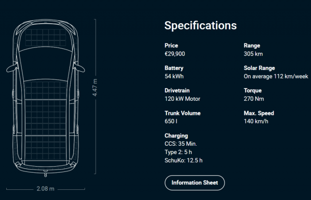 這款太陽能電動車Sion配一臺120kW電機(jī),可以產(chǎn)生馬力161Ps,最大輸出扭矩270N·m。