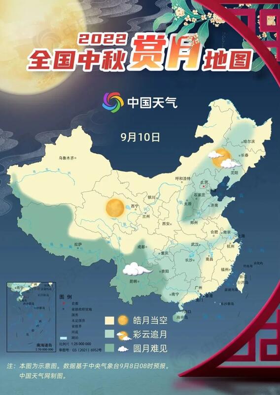 佳節(jié)來(lái)臨之際,中國(guó)天氣網(wǎng)發(fā)布2022全國(guó)賞月地圖。今年中秋節(jié)當(dāng)天(9月10日),西北地區(qū)和東南沿海賞月天氣條件較好,新疆、青海、甘肅、寧夏、陜西等地都將皓月當(dāng)空。(來(lái)源:中國(guó)天氣網(wǎng))