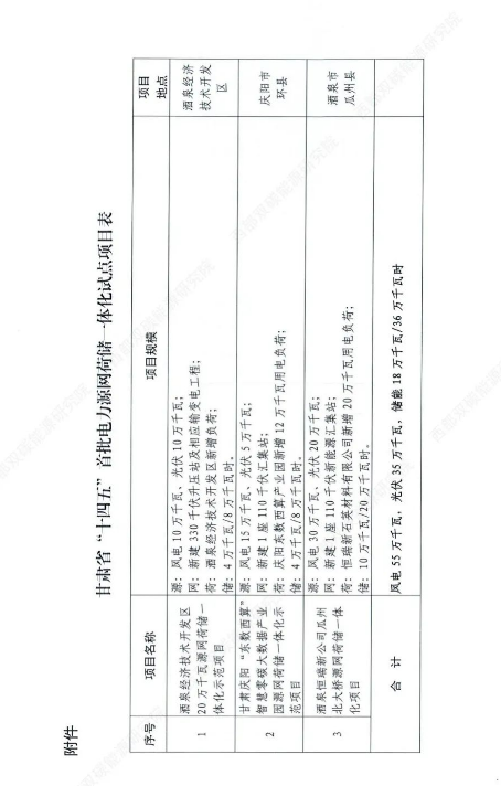 根據(jù)文件,酒泉經(jīng)濟(jì)技術(shù)開發(fā)區(qū)20 萬千瓦源網(wǎng)荷儲一體化示范項目、甘肅慶陽“東數(shù)西算”智慧零碳大數(shù)據(jù)產(chǎn)業(yè)園源網(wǎng)荷儲一體化示范項目、酒泉恒瑞新公司瓜州北大橋源網(wǎng)荷儲一體化項目等3個項目建設(shè)方案總體符合國家相關(guān)要求,同意列為甘肅省“十四五”首批電力源網(wǎng)荷儲一體化試點項目,其中風(fēng)電55萬千瓦,光伏35萬千瓦,儲能18萬千瓦/36萬千瓦時。