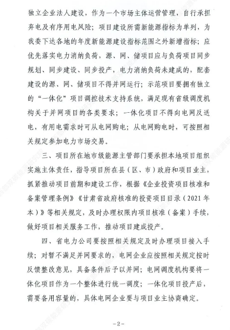 一體化項目包含的電源、電網(wǎng)、負(fù)荷、儲能由一個獨立企業(yè)法人建設(shè),作為一個市場主體運(yùn)營管理,自行承擔(dān)棄電及有序用電風(fēng)險;項目建設(shè)所需新能源指標(biāo)為單列,為甘肅省發(fā)改委下達(dá)各地的年度新能源建設(shè)指標(biāo)范圍之外新增指標(biāo);應(yīng)優(yōu)先落實電力消納負(fù)荷,源、網(wǎng)、儲項目應(yīng)與負(fù)荷項目同步規(guī)劃、同步建設(shè)、同步投產(chǎn),電力消納負(fù)荷未建成的,配套建設(shè)的源、網(wǎng)、儲項目不得并網(wǎng)運(yùn)行;示范項目要擁有獨立 的“一體化”項目調(diào)控技術(shù)支持系統(tǒng),滿足現(xiàn)有省級調(diào)度機(jī)構(gòu)關(guān)于并網(wǎng)項目的各類要求;一體化項目不得向電網(wǎng)反送電,有用電需求時可從電網(wǎng)購電;從電網(wǎng)購電時,可按照相關(guān)規(guī)定參加電力市場交易。