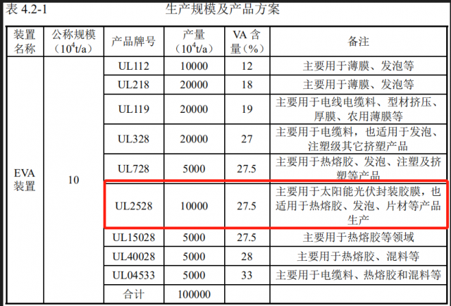 據(jù)悉,該項(xiàng)目共生產(chǎn) 9 個(gè)牌號(hào)的 EVA 產(chǎn)品,其中牌號(hào)UL2528產(chǎn)品可用于生產(chǎn)光伏料,產(chǎn)能為1萬噸/年,其VA含量為27.5%。