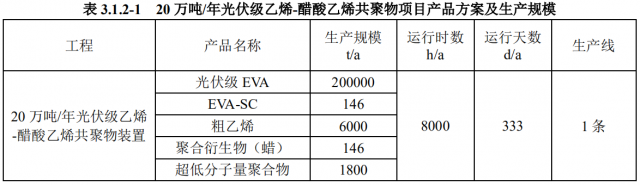 20 萬噸/年光伏級(jí)乙烯-醋酸乙烯共聚物項(xiàng)目具體產(chǎn)品方案及生產(chǎn)規(guī)模見下表。
