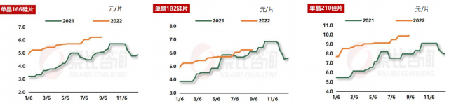 根據(jù)索比咨詢對多家硅片制造商的調(diào)研:就8月硅片價格行情來看,單晶166mm均價漲至6.24元/片,較7月環(huán)比上升2.1%;單晶182mm均價漲至7.48元/片,較7月環(huán)比上漲2.2%;單晶210mm均價漲至9.88元/W,較7月環(huán)比上升2.9%。