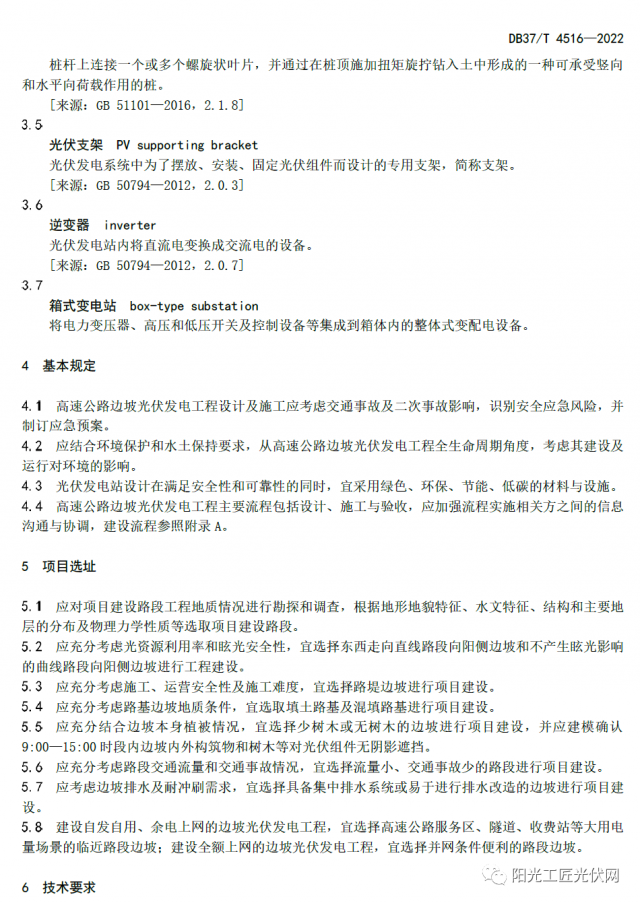 山東高速集團(tuán)黨委常委、副總經(jīng)理石振源回答說(shuō),本標(biāo)準(zhǔn)是在現(xiàn)行光伏發(fā)電工程建設(shè)技術(shù)標(biāo)準(zhǔn)體系下,根據(jù)高速公路特點(diǎn)制定的。標(biāo)準(zhǔn)規(guī)定了邊坡光伏發(fā)電工程的項(xiàng)目選址、施工交通組織、監(jiān)控測(cè)量、環(huán)境保護(hù)與水土保持等技術(shù)要求,內(nèi)容詳細(xì)、全面、完整,具有較強(qiáng)的專(zhuān)業(yè)性和操作性。
