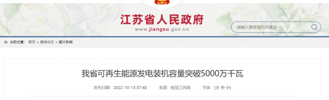 截至2022年10月11日,江蘇省可再生能源發(fā)電總裝機(jī)突破5000萬千瓦,達(dá)到5109萬千瓦,其中風(fēng)電2247萬千瓦,光伏2277萬千瓦,生物質(zhì)295萬千瓦,抽水蓄能260萬千瓦,儲能30萬千瓦。