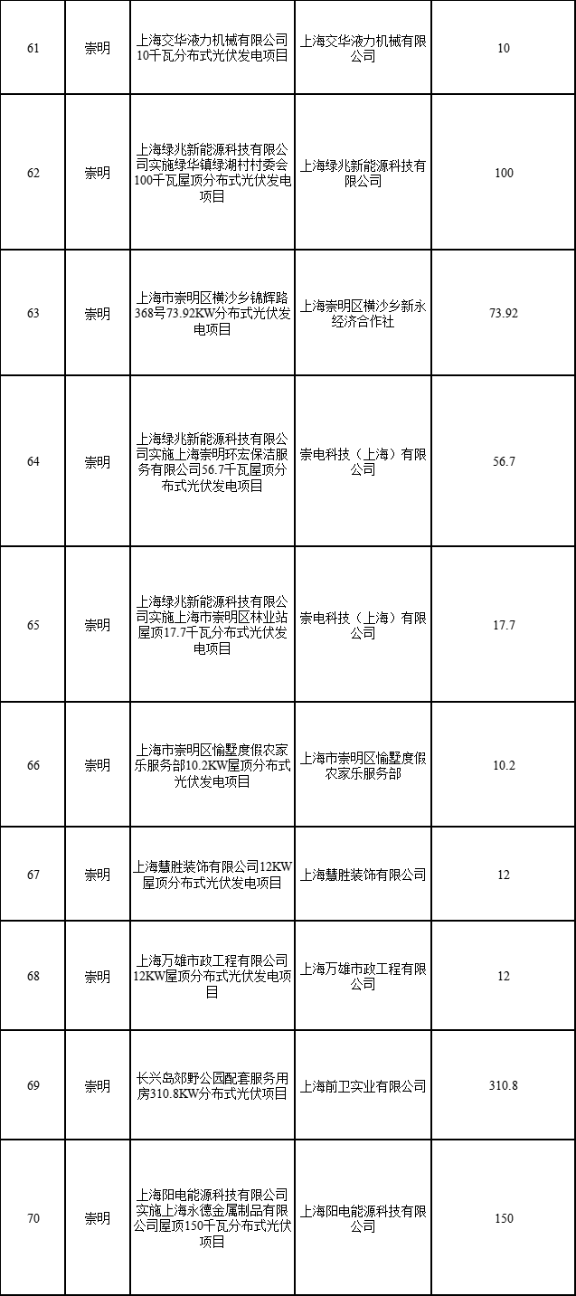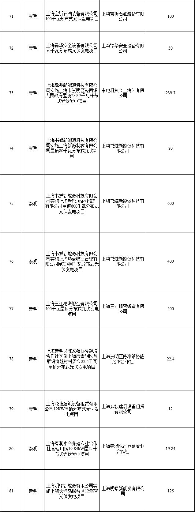 13個項目申請項目變更條件予以確認,其中:企業(yè)分布式項目5個。(1)經青浦區(qū)發(fā)展改革委申請核實,“上海電氣建筑節(jié)能有限公司利用國展中心屋頂建設2.2MW分布式光伏電站項目(2017年第二批目錄)”,單位名稱從“上海電氣建筑節(jié)能有限公司”變更為“上海電氣數智生態(tài)科技有限公司”。(2)經崇明區(qū)發(fā)展改革委申請核實,“上海綠兆新能源科技有限公司實施崇匠建設(上海)有限公司52.02KW屋頂分布式光伏發(fā)電項目(2021年第一批目錄)”,單位名稱從“上海綠兆新能源科技有限公司”變更為“崇電科技(上海)有限公司”。(3)經嘉定區(qū)發(fā)展改革委申請核實,“上海圣飛新能源嘉定區(qū)興賢路789號上海連盈螺絲有限公司559千瓦分布式光伏發(fā)電項目(2021年第一批目錄)”,單位名稱從“上海圣飛新能源科技有限公司”變更為“嘉興勝錦新能源有限公司”。(4)經金山區(qū)發(fā)展改革委申請核實,“上海復鏑實業(yè)有限公司20千瓦分布式光伏發(fā)電項目(2018年第一批目錄)”,單位名稱從“上海復鏑實業(yè)有限公司”變更為“上海復鐳投資管理有限公司”。(5)經閔行區(qū)發(fā)展改革委申請核實,“國核工程有限公司146.965KWp屋頂分布式光伏發(fā)電項目(2020年第一批目錄)”,單位名稱從“國核工程有限公司”變更為“上海核工程研究設計院有限公司”。