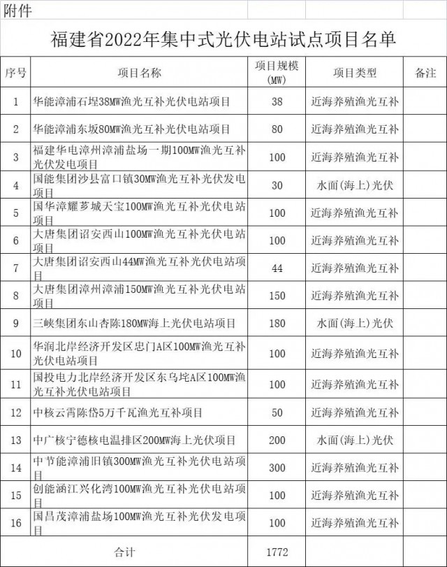 根據(jù)《福建省發(fā)展和改革委員會關于組織開展2022年集中式光伏電站試點申報工作的通知》(閩發(fā)改能源〔2022〕190號)相關要求,經組織對各地上報的項目進行審核,現(xiàn)將我省2022年集中式光伏電站試點項目名單予以公布,并就有關事項通知如下: