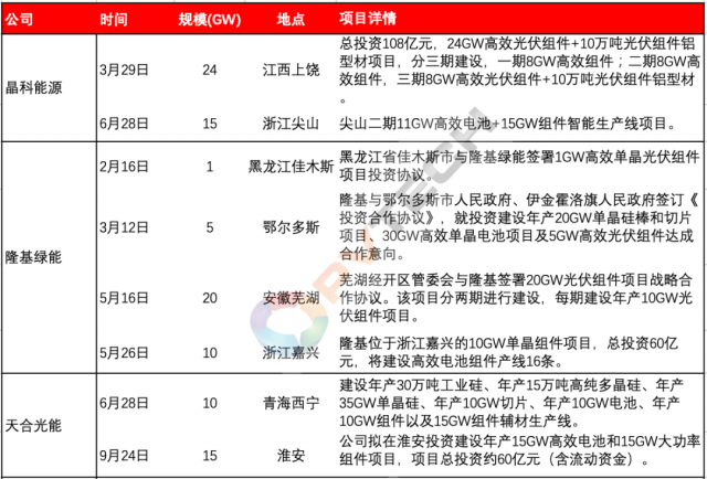 今年以來,以晶科能源、隆基綠能、天合光能、晶澳科技等為代表的行業(yè)第一梯隊(duì)主流組件大廠為鞏固各自市場地位、把握行業(yè)發(fā)展帶來的市場機(jī)遇,均在積極投資新建組件產(chǎn)能。