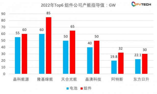 而根據(jù)晶科、隆基、天合、晶澳、阿特斯、東方日升 2022中報披露的數(shù)據(jù),到2022年底,各家組件規(guī)劃產(chǎn)能分別為60GW、85GW、65GW、50GW、32GW、30GW,這六 家公司2022 年底組件產(chǎn)能將達(dá)到322 GW,數(shù)值驚人。