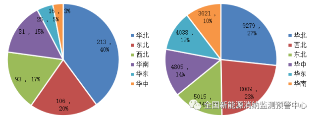三季度各區(qū)域風(fēng)電新增(左)、累計(jì)(右)裝機(jī)(萬(wàn)千瓦)